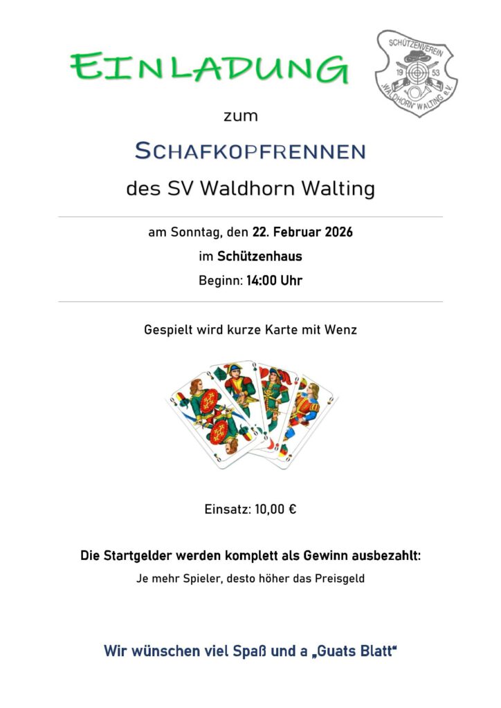 Am Sonntag, den 22. Februar 2026 findet das traditionelle Schafkopfrennen des Schützenverein Waldhorn Walting im Schützenhaus in Walting statt. Los geht’s um 14:00 Uhr. Das Startgeld beträgt 10,00 € pro Person und gespielt wird kurze Karte mit Wenz.