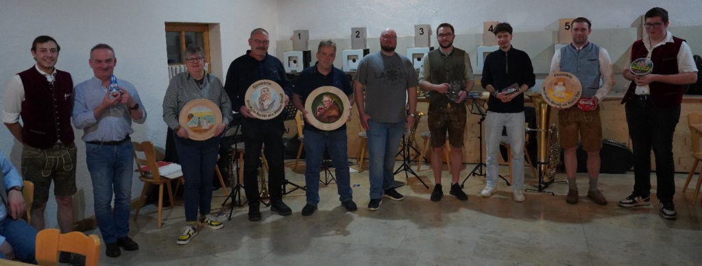 Auf die Gaudi-Scheibe konnten sich die 5 Schützen, die am nächsten an den Referenzschuss – einem 1126 Teiler – kamen, einen Sachpreis aussuchen. Die wenigste Differenz hatte Reiner Strauß mit 27,5 Teilern. Platz 2 ging an Fabian Vögele, Platz 3 an Karin Jäger, Platz 4 an Jonas Kerler und der fünfte Preis an Martin Tratz sen.
